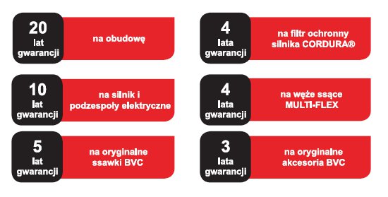 Gwarancji podlega nie tylko odkurzacz, ale też wszystkie akcesoria sprzedawane wraz z jednostką. Gwarancja na oryginalne akcesoria BVC wynosi 3 lata, a na oryginalne ssawki BVC 5 lat. Wyjątkowo węże ssące MULTI-FLEX, z zintegrowanymi ssawkami w rękojeści, posiadają gwarancję na 4 lata.